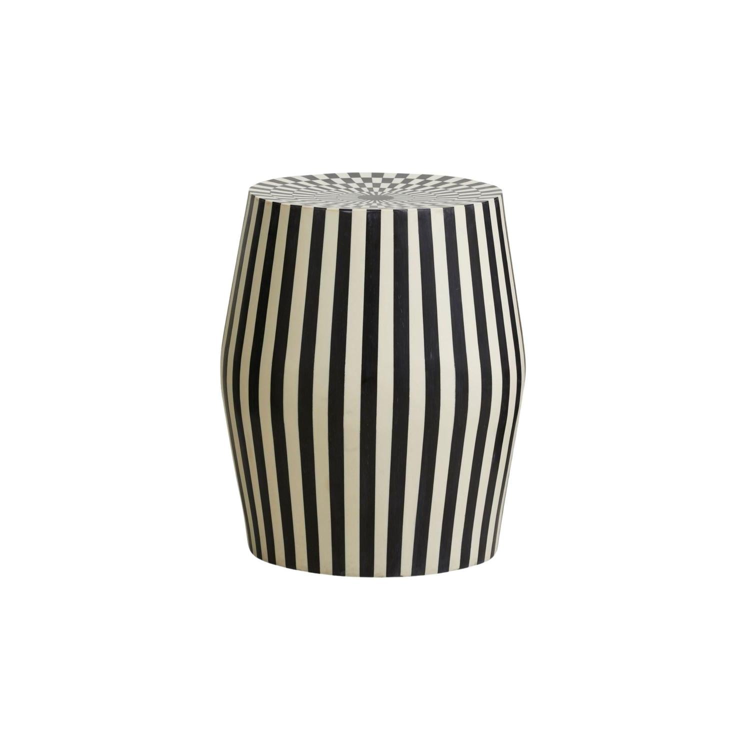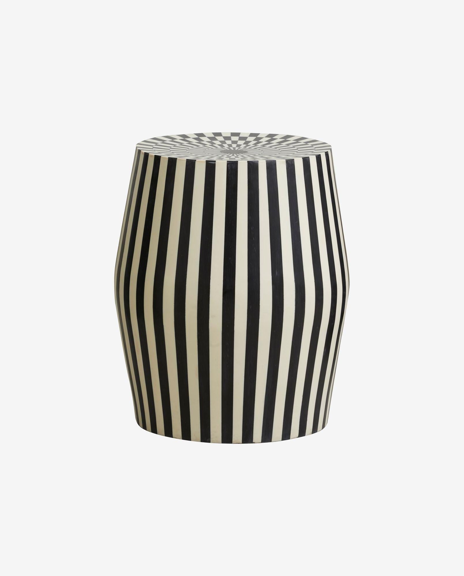 Gefertigt aus einer Kombination aus Harz und einer Platte aus Mangoholz, überzeugt der Tisch durch seine Stabilität und seine ausdrucksstarke Optik. Die schwarz-elfenbeinfarbenen Streifen bringen Dynamik und Eleganz in jeden Raum – ob als Beistelltisch, Hocker oder Deko-Element.
